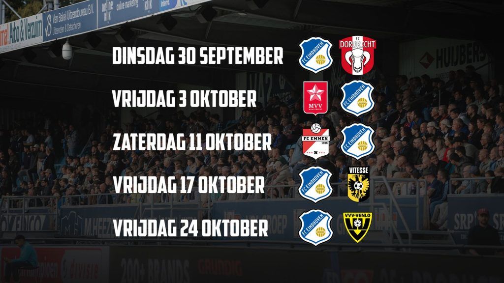 Vrijdagavond 3 oktober en zaterdagavond 11 oktober speelt FC Eindhoven uitwedstrijden tegen MVV en FC Emmen. De verkoop voor seizoenkaarthouders is iets gewijzigd: seizoenkaarthouders bestellen hun tickets voortaan op dezelfde manier als niet-seizoenkaarthouders. Het verschil zit in de prijs:
