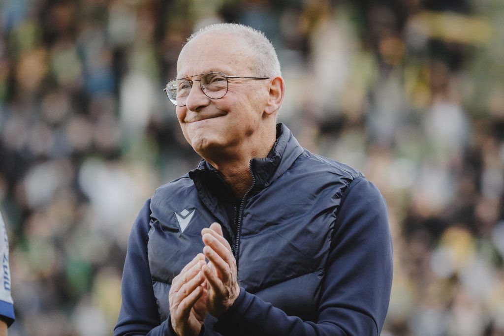 Trainer Jan Poortvliet bedankt de meegereisde supporters