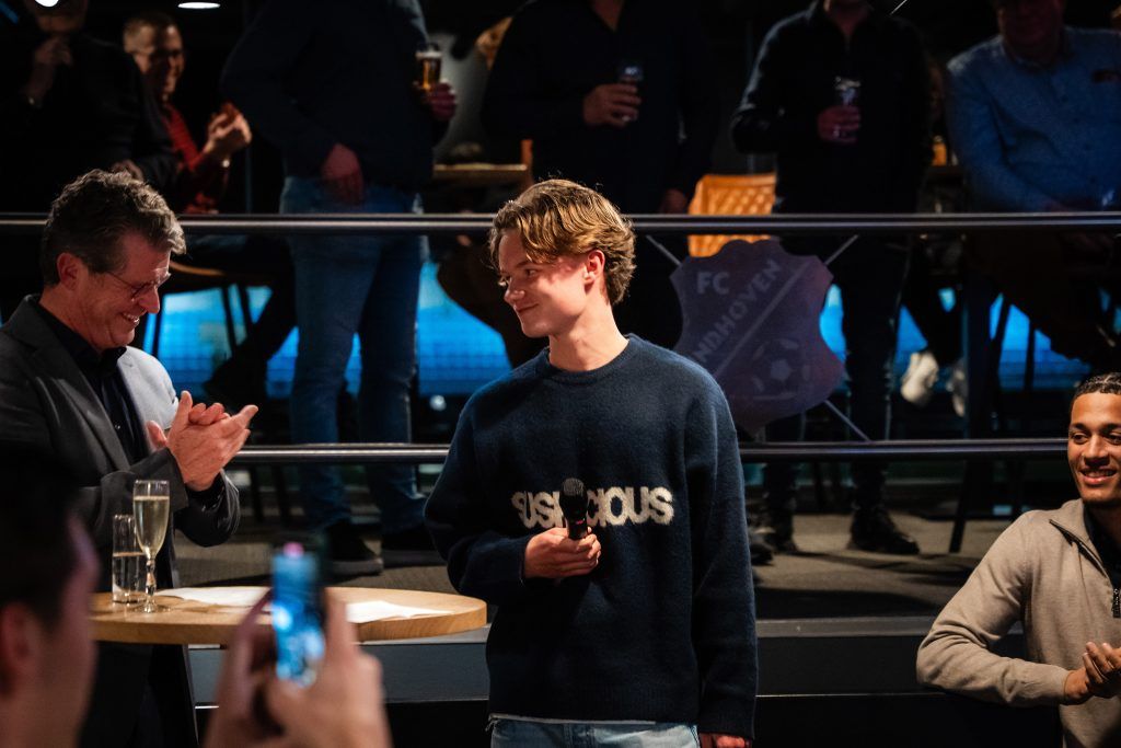 Een bijzonder moment volgde toen drie spelers uit de eigen opleiding naar voren werden gehaald. Thijs Muller, Zakaria Haddaoui en Owen Renfrum mochten deze dag hun eerste profcontract tekenen. Owen, inmiddels al acht seizoenen actief binnen de club, sprak trots over het moment waarop hij zich voor het eerst officieel prof mocht noemen. Ook Zakaria liet weten zijn handtekening te hebben gezet onder zijn eerste contract. Met een knipoog werd het rijtje compleet gemaakt toen Thijs eraan herinnerde dat ook hij zich die middag had verbonden aan FC Eindhoven. Een mooie bevestiging van het vertrouwen in de volgende generatie Blauwwitters.