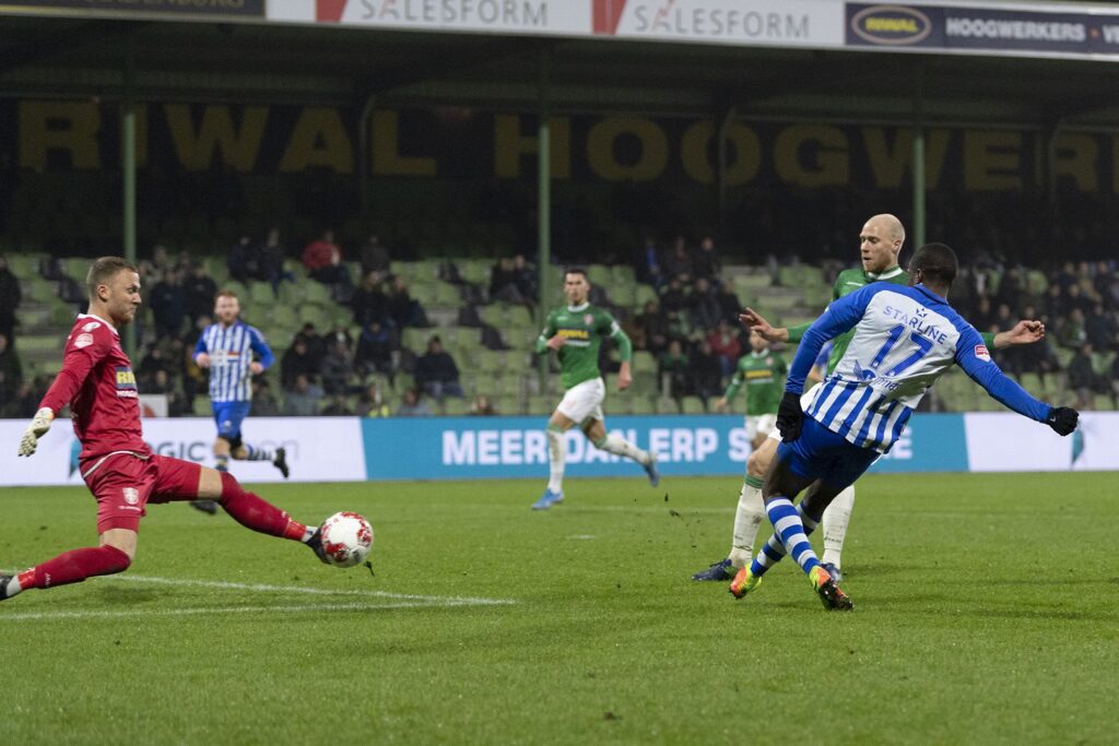 In de extra tijd kwam FC Dordrecht alsnog op voorsprong. Op het schot van buiten de zestien bracht Ruud Swinkels in eerste instantie nog redding, maar de bal belandde recht voor de voeten van Quincy Hogesteger. De invaller schoof de bal in een leeg doel. Hierdoor keerde de Blauw-Witten zonder punten terug naar de Eindhoven.
