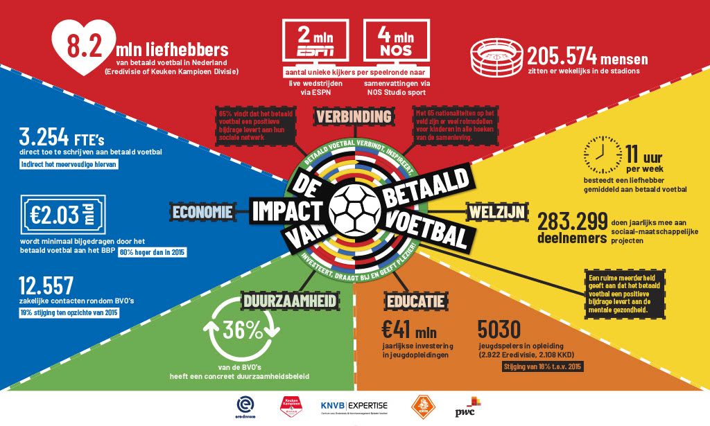 Betaald voetbal is niet ‘maar een spelletje’, het speelt een belangrijke rol in het leven van miljoenen mensen in Nederland. Hoeveel impact het op de maatschappij heeft, is in kaart gebracht door PwC. De belangrijkste conclusies van dit onderzoek getiteld De maatschappelijke impact van het betaald voetbal zijn: